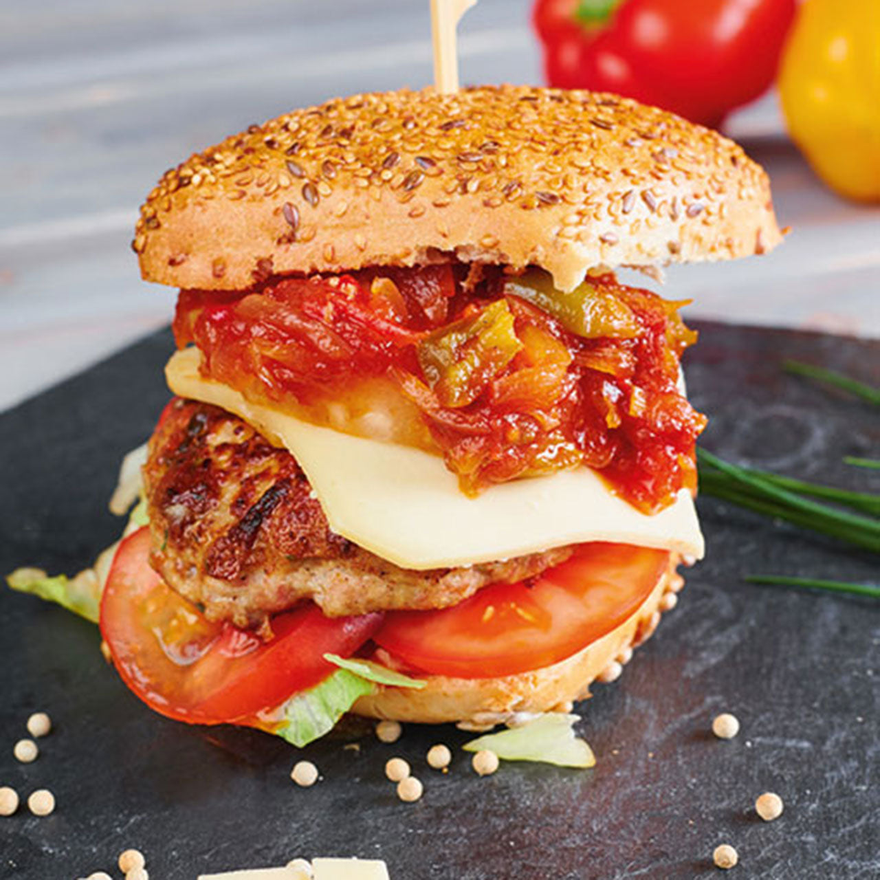 Hierzu erwärmen wir kurz ein großes Roggenbrötchen. Ein Rumpsteak 150 g englisch braten und gut würzen. ½ rote Zwiebel, Eisbergsalat 4 Scheiben Tomate 3 Scheiben Atta-Käse BBQ Sauce Das Rumpsteak...